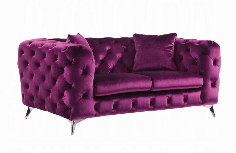 Elegant and eye-catching, the beautiful Atronia loveseat and chair is the perfect addition to any space. Chic button-tufted design in a vibrant bright purple cover brings both sophistication and personality to your room. Crafted with a sturdy wood frame and sleek chrome legs, this loveseat combines durability with modern style, making it a standout piece in any living area.