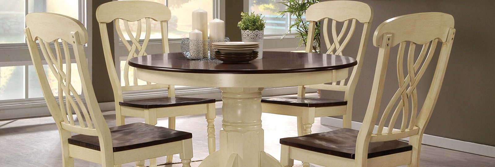The Dylan collection brings cozy country charm to your dining space with its warm buttermilk and oak finish. Featuring a round table with a classic empire pedestal base, this set is paired with high-back dining chairs for a welcoming and timeless appeal. The table showcases a solid wood top in oak with a buttermilk pedestal base, creating a two-tone look that blends rustic tradition with elegant simplicity. The matching side chairs feature an overlapped “X” backrest, turned legs, and wooden seats for durability and style, making this set perfect for everyday dining or casual entertaining.