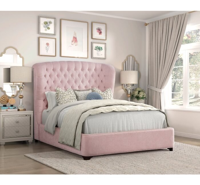 Serving as the grand focal point of your bedroom, the Cameo Collection is a beautiful statement of your elegant decorative preferences. The mansion-style shelter headboard features button tufting and a wing profile, solidifying its classic style. Fully upholstered, the pink chenille fabric that covers the California King bed is both a textural and visually soft complement to your chic aesthetic.