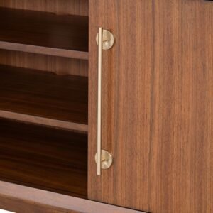 The Hepburne 70″ TV Stand brings timeless mid-century modern style to your living room. Crafted from acacia wood, rubberwood, and solid poplar, it features a rich walnut finish, gold-capped legs, and sleek adjustable shelves for flexible storage. With its clean lines and warm wood tone, the Hepburne TV stand is both stylish and functional, making it the perfect anchor for your entertainment space.