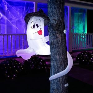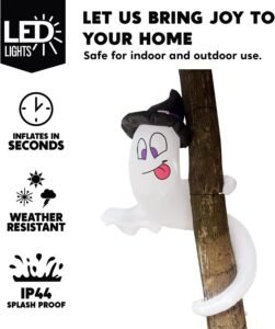 Add a touch of spooky fun to your yard this Halloween with the Joiedomi 5-Foot Inflatable Ghost, twining playfully around a tree and glowing with bright built-in LEDs. Designed with a cheerful smile and witch hat, this blow-up ghost creates a family-friendly atmosphere that lights up your nights with festive charm.