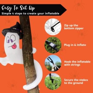 The durable, weather-resistant PVC and UL-certified plug ensure safe use indoors or outdoors. Easy to set up and take down, it includes ropes, stakes, and an extended cord for secure placement. Whether for trick-or-treat events, haunted houses, or fall garden displays, this inflatable ghost instantly transforms your yard into a glowing Halloween scene.