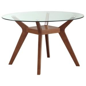 Dive into the vintage charm of a mid-century five-piece dining table set. A lovely table seats four, featuring a round top of clear tempered glass that adds modern appeal. An intriguing table base features four V-shaped legs unified with a center shelf perfect for a single piece of decor that emphasizes your personal style. Four included chairs are charming and comfortable, featuring tufted black leatherette seats and backs with foam padding. Scandi style frames support the chairs as they show off a nutmeg wood finish that’s warm and inviting in your kitchen or dining room.