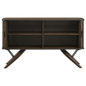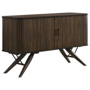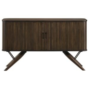 Elevate your dining area with this mid-century modern sideboard. The Wes features sleek tambour doors with fingertip pulls for a subtle nautical touch, while flared tapered legs deliver a bold retro silhouette. Finished in rich dark walnut, it provides concealed, flexible storage for dishes, glassware, and everyday essentials—keeping your space elegant and functional.
