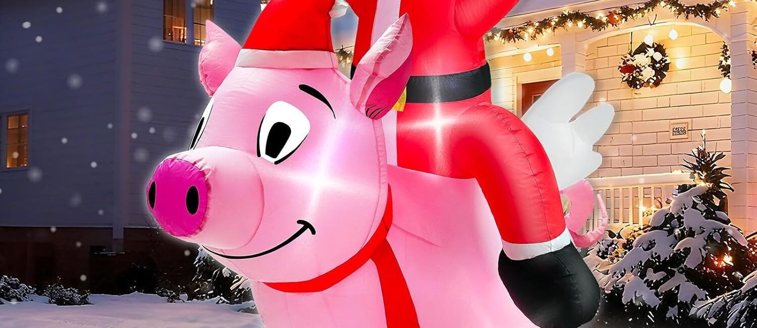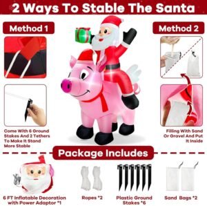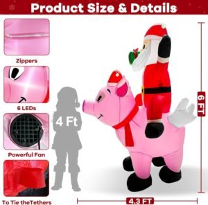 6 Ft Funny Christmas Inflatable Santa: 6*4.3*3.7(H*L*W) blow up Christmas decorations outdoor is designed as a Santa Claus riding on a flying pink pig; Built-in 6 LEDs lights, the Santa inflatable outdoor will add a whimsical touch to your Xmas yard décor