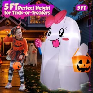 - 5FT Cute Halloween Inflatables Ghost with Bright LED Lights: Zukakii designed this Halloween Decorations Outdoor wearing a pink bow, carrying a glowing pumpkin basket, and holding a pink lollipop. The built-in LEDs create a whole-body playful glow that delights without frights and captures children’s imagination. Perfect for sparking joy and adding Halloween fun to yard displays and little monsters’ parties